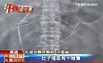 中國臺灣網8月10日消息 據臺灣TVBS電視臺報道,臺灣高雄市1名80歲的老婦人因腹痛且高燒不退就醫,醫生在其肚子里發現多達16根縫衣針,其中1根還垂直穿過十二指腸到達背部肌肉層,經開刀后取出其中15根,老婦人目前暫無生命危險。