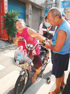 昨天早上7時,56歲的張金蓮騎電動車行經一路口時,左腳踩空,左小腿夾進踏板與車身間抽不出來,停車在路口不斷哀號。