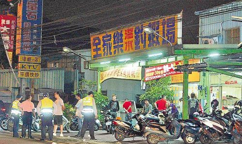 兩女爭風吃醋引發槍擊砍人,警方到釣蝦場了解,引來群眾圍觀。(圖片來源:臺灣媒體)