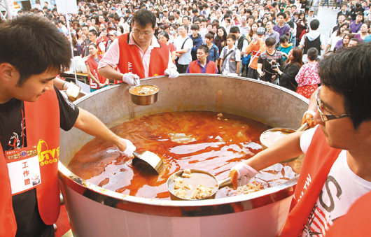 臺灣“史上最大臭豆腐罐頭”及最多人同時分食臭豆腐挑戰吉尼斯世界紀錄活動。(圖片來源:臺灣《聯合報》報道)