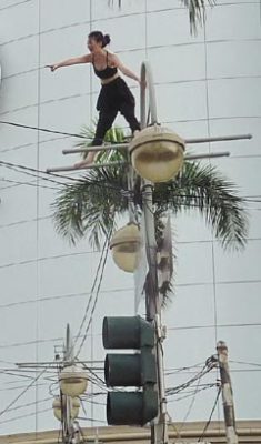 昨天下午2時許,許女到屏東縣刑警大隊找鄭男討債不成,氣得爬上警局前燈桿,哭喊“欠錢的警察出來下跪,不下跪就跳下去死給你看”,許女邊罵邊脫掉衣服,只剩下黑色內衣,并將長發挽起,不停地叫罵。