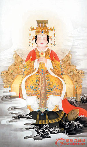 2010年6月19日,全國道德主題教育組織委員會在北京國際文化交流中心舉行“海峽兩岸文化交流暨媽祖圣像交接儀式”,《媽祖護佑中華》畫作由北京三百書畫院長高運甲移交給時任臺灣中正紀念堂管理處長的臺灣代表曾坤地。(中國臺灣網 劉海偉)