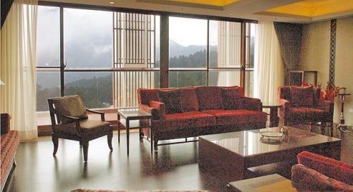 臺(tái)灣阿里山賓館總統(tǒng)套房客廳配有價(jià)值百萬(wàn)新臺(tái)幣的檜木家具和擺飾,從房?jī)?nèi)可眺望山景。(圖片來(lái)源于臺(tái)媒)