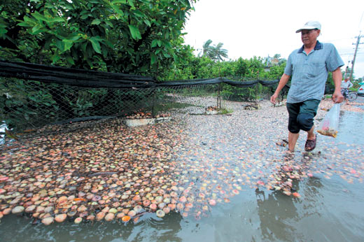 豪大雨造成屏東林邊淹水不退,當地蓮霧落果嚴重,農民欲哭無淚,擔心連蓮霧樹株也將不保。圖片來源:臺灣《聯合報》