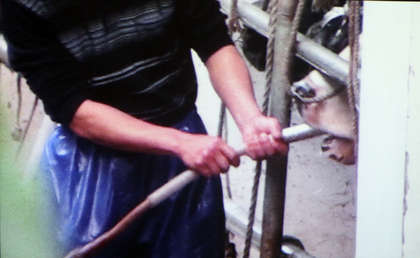 中國(guó)臺(tái)灣網(wǎng)6月26日消息 據(jù)臺(tái)灣媒體報(bào)道,臺(tái)灣動(dòng)物社會(huì)研究會(huì)今召開(kāi)記者會(huì),指控新北市和臺(tái)南市2間屠宰場(chǎng)虐待牛,在牛屠宰前用管強(qiáng)插牛胃灌水,借以增加重量,提高販賣(mài)價(jià)錢(qián)。若牛抵抗,動(dòng)輒以塑料條鞭打牛,甚至將牛頭以繩子綁在欄桿,以鐵絲穿牛鼻固定,讓牛承受巨大疼痛,無(wú)法轉(zhuǎn)頭或休息。