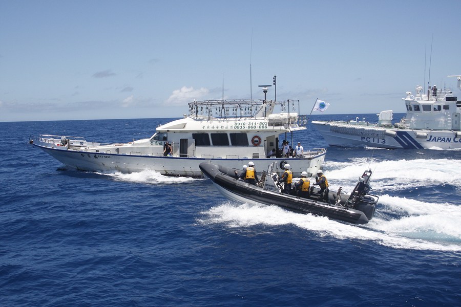 7月3日,世界華人保釣聯盟9人向釣魚島出發。據日本共同社7月4日報道稱,經日本第11管區那霸海上保安部確認,臺灣“活動家”乘坐的漁船駛入了釣魚島附近“日本領海”。圖為日方巡邏船與“保釣”漁船交涉。