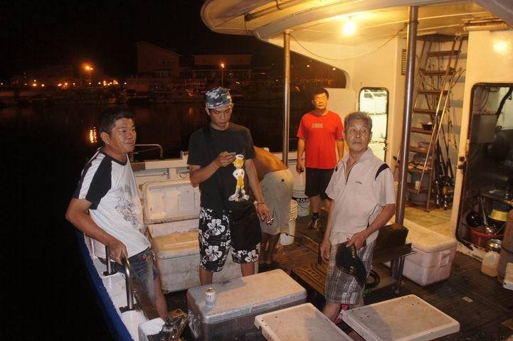 7月3日晚11點20分,世界華人保釣聯盟主席黃錫麟,理事張春明及會員游嘉文等,乘坐全家福六號向釣魚島出發。圖為保釣人士張春明,黃錫麟,游嘉文,游明川(由右至左)。