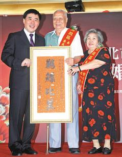 臺北市民政局昨天首次舉辦“恩愛50載 金婚表揚”活動,共選出30對金婚代表參加表揚,市長郝龍斌到場祝賀。來源:臺灣《聯合報》
