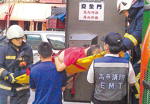 消防人員將昏迷的司機李志明從學生專車后方安全門抬下送醫。(圖片來自臺媒)