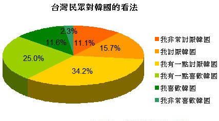 報道說,近年來韓國的商品大舉進入臺灣市場,日常用品、明星藝人到醫學美容技術,無不充斥在臺灣民眾的生活中,但臺灣創市際市場顧問研究公司所做的調查顯示,61%臺灣民眾討厭韓國,其中更有11%的民眾表示非常討厭韓國。