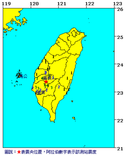 最大震度4級(jí),出現(xiàn)在嘉義縣大埔鄉(xiāng)、嘉義市,此外,臺(tái)南市楠西、云林縣草嶺、高雄市桃源震度3級(jí),云林縣斗六市、臺(tái)東縣利稻震度為2級(jí),另外彰化縣、臺(tái)南市、南投縣、花蓮縣、臺(tái)中市、彰化市、澎湖縣為1級(jí)。(中國(guó)臺(tái)灣網(wǎng) 李帥)