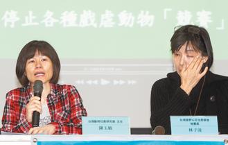 臺灣動物研究會主任陳玉敏(左)與臺灣蠻野心足生態(tài)協(xié)會秘書長林子凌(右),昨天看到原住民在祭典中的“抓雞”與“抓豬”畫面,忍不住落淚。圖片來自臺灣《聯(lián)合報》