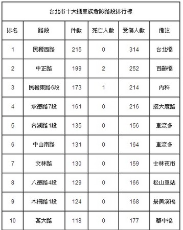 在十大危險路段中,最危險的要數民權西路,此路段銜接臺北大橋至新北市,為上班族上下班的必經要道,非常容易因人員擁擠致使發生交通事故,而中正路銜接百齡橋至新北市,也因路段人流量高致使出事幾率增加,此外,其它路段則因為臨近重要場所或車流量高而事發頻繁。