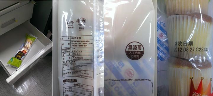 洪浩云表示,某天他在值班室休息的時候很無聊,于是翻翻柜子找找抽屜,想找點東西看看,然后在抽屜里發現了杯子蛋糕。剛好肚子餓了,正想吃的時候,瞄到了它的保存期限:2012.08.27,過期了快一年。“我當下整個人精神來了,仔細看著這包未拆封的蛋糕,有趣!”