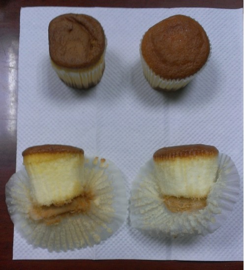 他說,他買了一袋一樣的杯子蛋糕,“接著就是老少對決了,如果用有效日期作標題的話,就是“2012.08.27 VS 2013.07.22”,光看外表,老了一歲的蛋糕有點扁,顏色比較不那么鮮艷,但是把下面掰開一看,里面都是很鮮嫩的!”