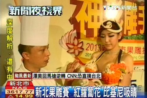 據臺灣TVBS網站報道,臺灣新北市第二屆果雕競賽,本周六、日即將登場,120組選手角逐總額40萬元(新臺幣,下同)的獎金,19日比賽前哨站,特地邀請國際果雕師傅大展刀工,除了5分鐘用水果打造兔子,小鴨等造型,還用紅蘿卜、芋頭雕出比基尼和頭冠,讓現場模特兒穿在身上。