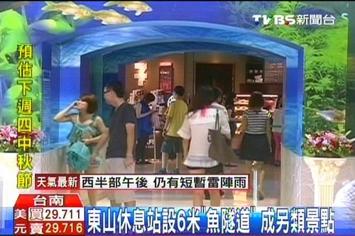 據臺灣TVBS網站報道,休息站現在功能已經不只讓民眾過路休息,現在各地休息站要想辦法讓休息站成為一處景點,在臺南東山休息站,就特別在休息站內打造一個魚隧道,供民眾在休息之余還可以在隧道內觀賞水庫生態,不過因為水庫的魚都是一些吳郭魚和草魚,比較常見,民眾覺得應該要放一點鮮艷的海水魚比較漂亮。