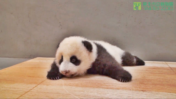 睜著大大的眼睛,圓仔趴在木板上開始學習匍匐前進,縮著兩只胖腳,不斷往前爬,往前爬行不通,還會選擇向右轉再試試,模樣超級可愛。動物園發言人張明雄說,圓仔現在前肢的運動協調性其實已經越來越好,工作人員會把比較粗糙面的木板鋪在地上讓牠趴在上面做后肢的運動訓練。