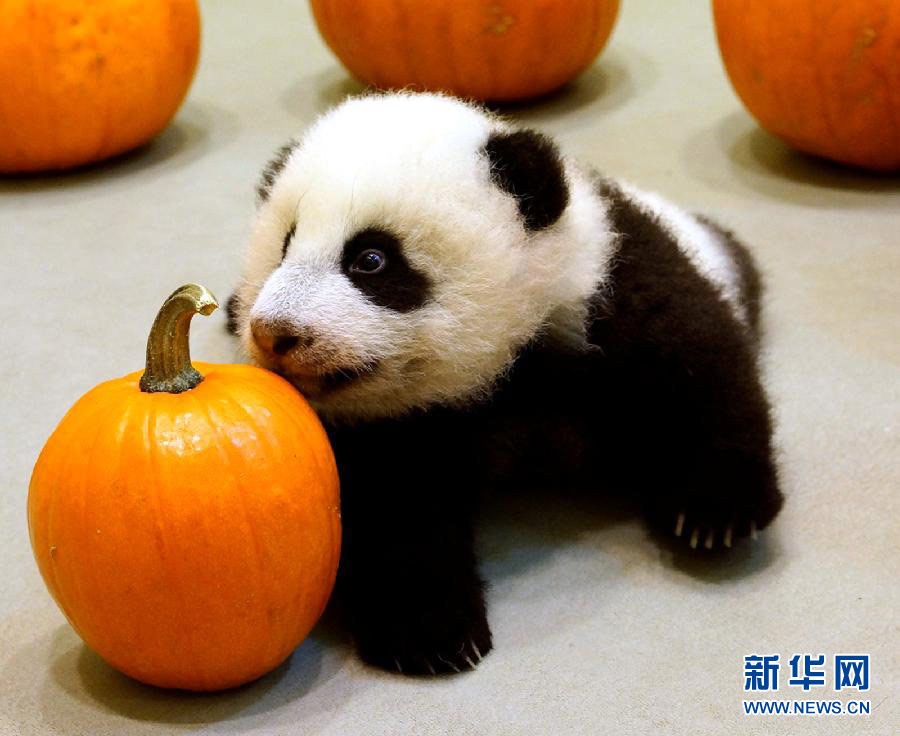 10月12日,正在學(xué)走路的“圓仔”在一個(gè)南瓜旁駐足