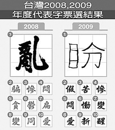 從2008年選出“亂”字,然后逐年選出“盼”、“淡”、“贊”、“憂”。(來自臺灣媒體)
