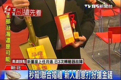 據報道,新北市今年的聯合婚禮預計送出專業婚禮紀錄DVD、炒菜鍋、臍帶血折價券和生育套房住宿券等多項好禮,但其中最受注目的還是限量的24K金鏟。