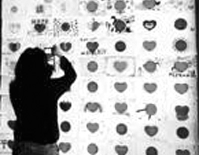 圖為展覽現場特別展出了香港藝術家文晶瑩策劃的“一人一心”藝術創作。800多幅來自臺灣、香港、日本、韓國和英國民眾的作品,以不同語言寫著“日本政府請道歉”、“用愛撫平傷痛”等,希望能用和平的方式發聲。