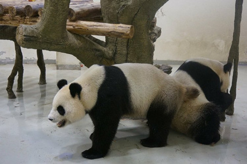 “圓圓”已經趴好交配位置,可惜“團團”只想跟“圓圓”玩,讓自然交配失敗收場。(臺灣《聯合晚報》/臺北市立動物園 提供)
