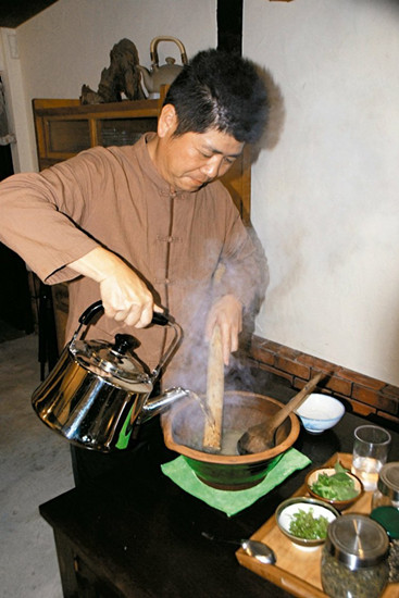 擂好的茶緩緩注入滾水,香氣竄鼻。圖自臺灣《聯合報》