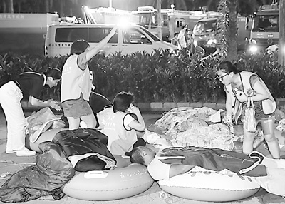 6月27日,在新北市八仙水上樂園,未受傷的民眾照顧受傷游客。