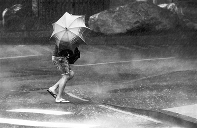 一名撐傘的路人在臺北市區冒著風雨行進。新華社記者 韓瑜慶攝