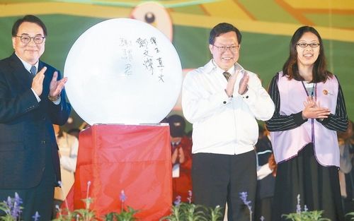 桃園市長鄭文燦(中)在瑜伽球上簽名留念,為燈會寫下完美句點。來源:臺灣《聯(lián)合報》