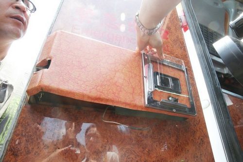 紅珊瑚車隊同款游覽車的安全門鎖,正常開啟方式,是得先取下壓克力板,才能開啟開關(guān)。(圖片來源:臺灣《聯(lián)合報》)