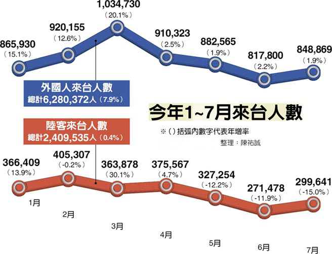 今年1至7月赴臺旅游人數。(臺灣《中時電子報》統計圖)