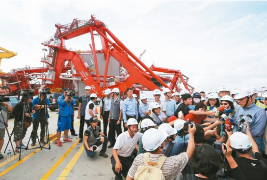 高雄港四座橋式起重機,被斷纜漂流的“風明輪”撞上嚴重毀損,臺“行政院長”林全(右)南下勘災。
