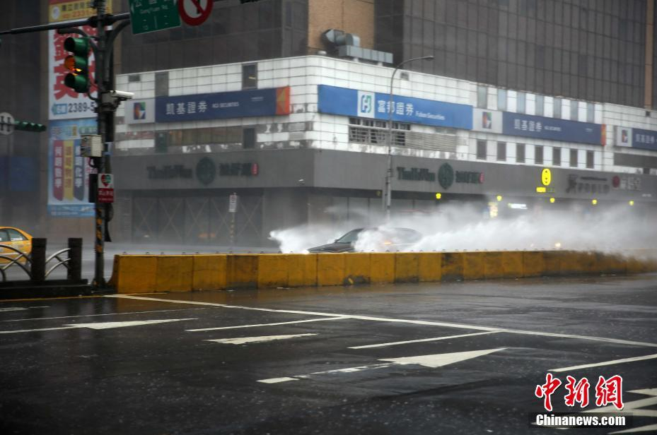 9月27日,“鲇魚”臺(tái)風(fēng)橫掃臺(tái)灣,強(qiáng)風(fēng)暴雨造成樹(shù)倒車翻,造成人員死傷。據(jù)臺(tái)灣災(zāi)害應(yīng)變中心統(tǒng)計(jì),至27日晚上8時(shí),臺(tái)風(fēng)造成4死268傷。圖為臺(tái)北車站前大街汽車駛過(guò),濺起一人多高的浪花。中新社記者 黃少華 攝