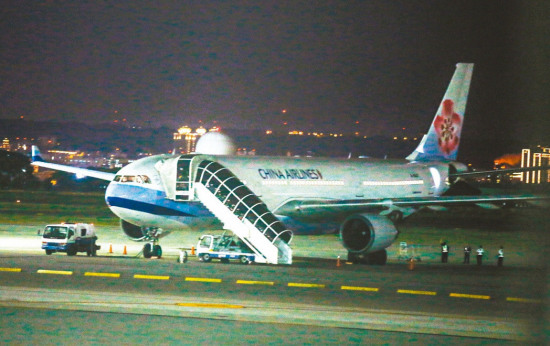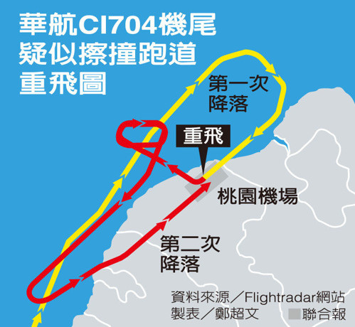 中華航空Cl704航班,昨晚從馬尼拉飛回桃園機(jī)場,降落時(shí)機(jī)尾疑似擦撞到跑道重飛。 臺(tái)灣《聯(lián)合報(bào)》圖