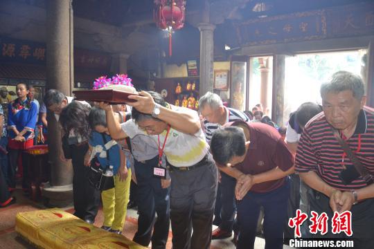 當天,在湄洲媽祖祖廟天后宮內,各家宮廟信眾身著統一廟服,敬備鮮花素果,恭捧分靈媽祖安座在祖廟媽祖金身膝前。而后,信眾們手執清香,依禮獻上貢品,并向媽祖行三鞠躬禮,答謝媽祖庇佑,祈福心愿達成。