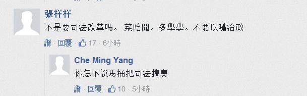 蔡英文也躺槍,“不是要司法改革嗎。 菜陰聞。多學學。不要以嘴治政”,“你怎不說馬桶把司法搞臭”