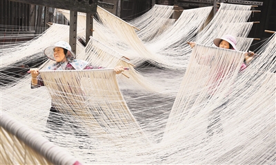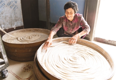 臺(tái)灣彰化縣福興鄉(xiāng)一些人家還保留著手工制作面線傳統(tǒng)。純手工面線制作要經(jīng)過(guò)醒面、盤(pán)條、拉面、上架、甩面、晾曬等多道工序,面細(xì)如絲,富有彈性。 圖為11月29日,村民在制作面線。