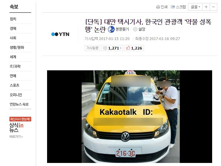 韓國《JTBC》電視臺主播稱,“在臺灣旅游的20多歲女大生,遭到計程車司機性侵,她們在喝了司機給的養(yǎng)樂多后,失去意識”;《YTN》主播說,“在臺灣旅游的兩名韓國女性,遭到當?shù)赜嫵誊囁緳C性侵”;《SBS》電視臺也請來記者和主播討論該新聞。