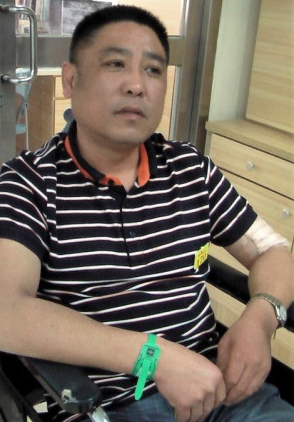 章國海事故發生后被送至高雄市立大同醫院急救,坐在輪椅裹傷邊打點滴邊受訪。