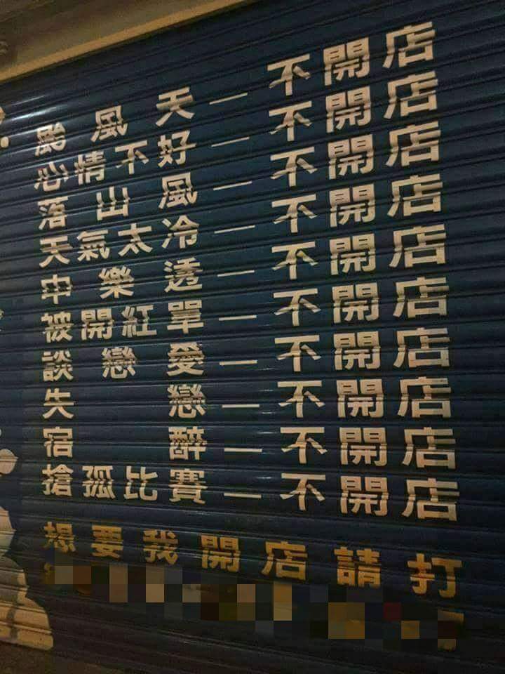 根據網友發表的圖片,該店面“颶風天不開店、心情不好不開店、落山風不開店、天氣太冷不開店、中樂透不開店、被開紅單不開店、太戀愛不開店、失戀不開店、宿醉不開店、搶孤比賽不開店”。