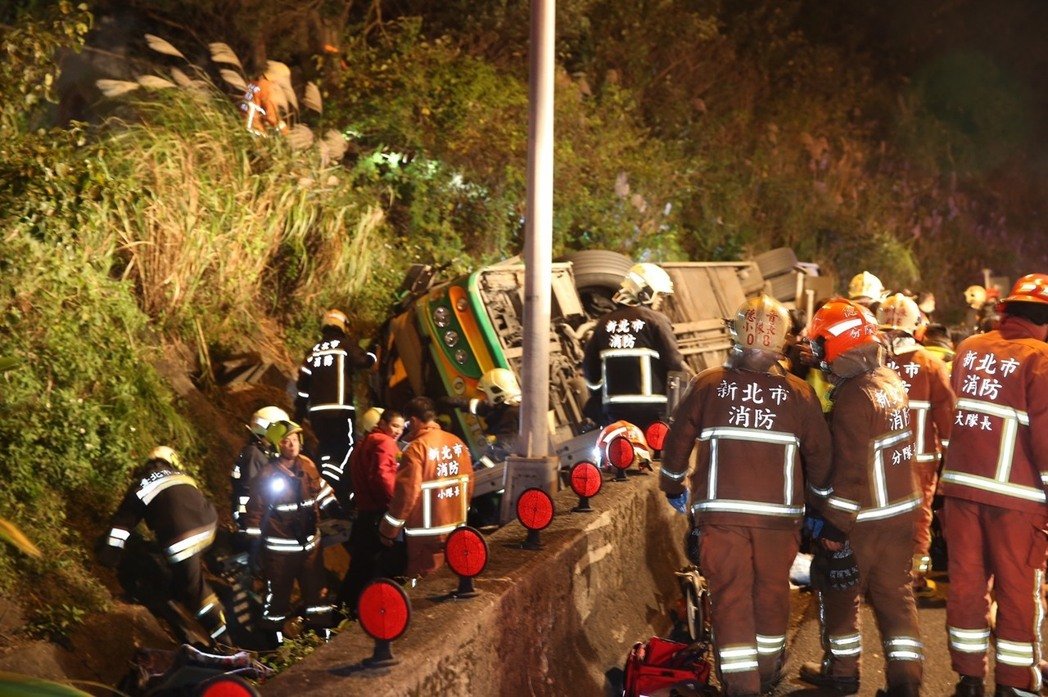 游覽車翻覆事故,約30多人受困。(圖片來源:臺灣《聯合報》)