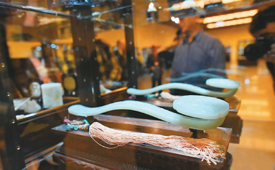唐宋遼金元玉器精品展近日在臺北開幕,1500余件歷代精品玉器吸引觀眾前來參觀。據悉,本次玉器精品展將持續至4月6日。圖為游客在玉器展上參觀。