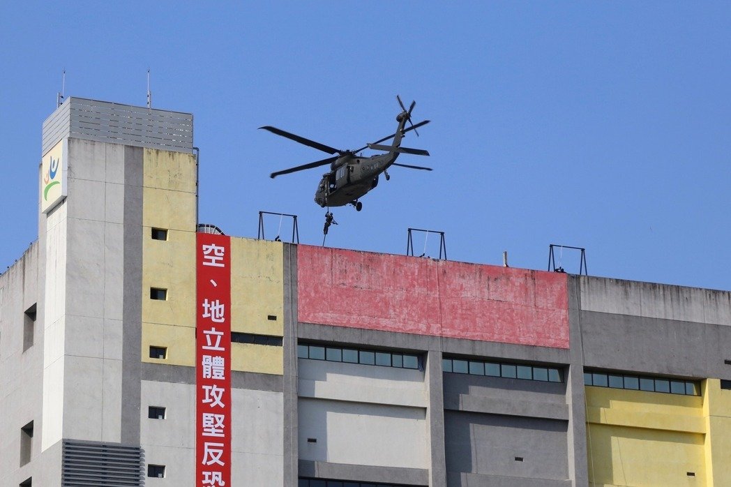 此外,針對恐怖攻擊,則模擬賽事期間發生恐攻并癱瘓周邊交通,多名恐怖份子逃竄于體育園區內,臺“警政署”依反恐機制向臺軍請求支持,由“憲兵”指揮部特種勤務隊配合黑鷹直升機實施空、地立體攻堅作業,運用繩索迅速垂降后再近戰格斗制伏歹徒。