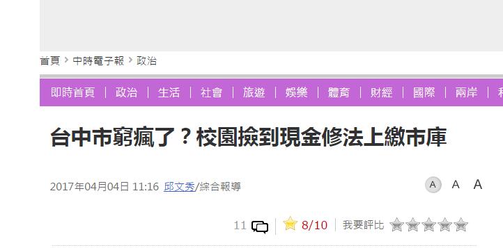環球網綜合報道 臺中市國民黨團日前召開記者會,批評市長林佳龍“偉人佳龍”舉債爆增。臺灣“聯合新聞網”3日又報道稱,臺中市各級學校這學期收到一份公文,內容是修訂各校“歸屬臺中市所有拾得物要點”,最受關注的是規定以后在校內撿到現金,全要列冊繳市庫。