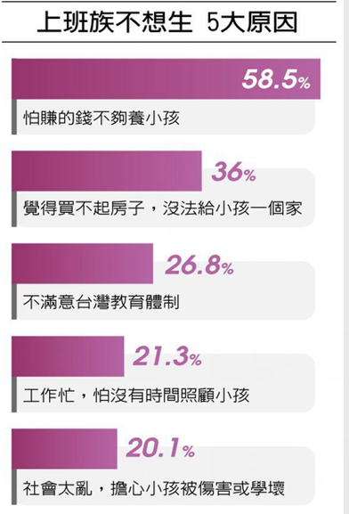 中國臺灣網4月14日訊 據臺灣《聯合報》報道,2008年,臺灣新生兒的出生數首度跌破20萬大關,2010虎年更只剩16萬余人,2012年龍年才回升至近10年最高的23萬余人,但后來又減少。去年出生人數僅20萬7600人。少子化已成臺灣社會的重大危機之一,但為什么臺灣人這么害怕生寶寶呢?一份調查說出了真相。(見上圖)