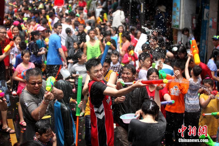 4月16日,臺(tái)灣新北市潑水節(jié)在永和區(qū)華新街舉行。華新街有“緬僑街”之稱,為早期南洋華僑遷居,主要以美食觀光業(yè)為主,自1998年起在這里舉辦的潑水節(jié)已經(jīng)成為當(dāng)?shù)胤浅S刑厣囊豁?xiàng)活動(dòng),每年都吸引不少民眾參加。圖為新北市潑水節(jié)現(xiàn)場(chǎng)。 中新社記者 龍敏 攝