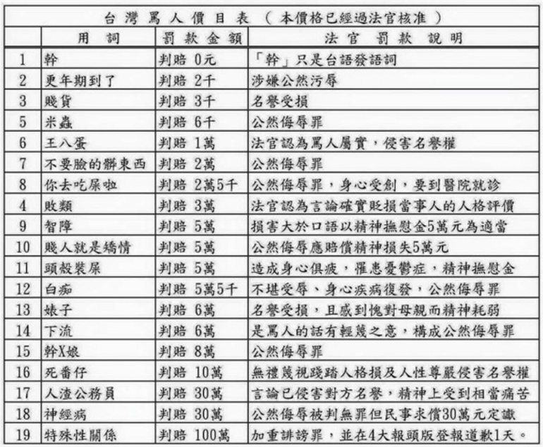 網友整理的“罵人價目表”中,法院判決無罪免罰,判例來自于一名汪姓女房仲(房屋中介人),去年3月和擺水果攤的黃姓男子爭吵,她被黃男辱罵一聲“干”字,氣得提告“公然侮辱”,黃男則否認口出惡言。