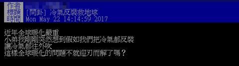 據東森新聞報道,這名網友發帖提到關于解決全球暖化的辦法,他表示,“假如我們把冷氣都反裝,讓冷氣都往外吹,這樣全球暖化的問題不就迎刃而解了嗎?”